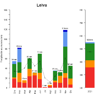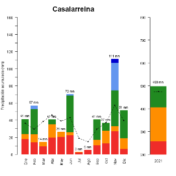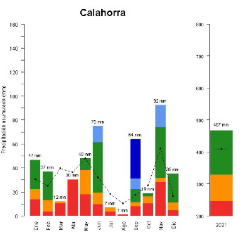 P75: Percentil 75. La precipitación acumulada es inferior a este valor en el 75% de los meses/años de la serie climática.