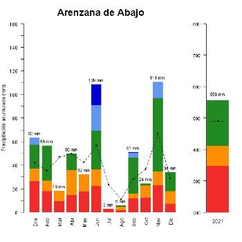 P90: Percentil 90. La precipitación acumulada es inferior a este valor en el 90% de los meses/años de la serie climática.