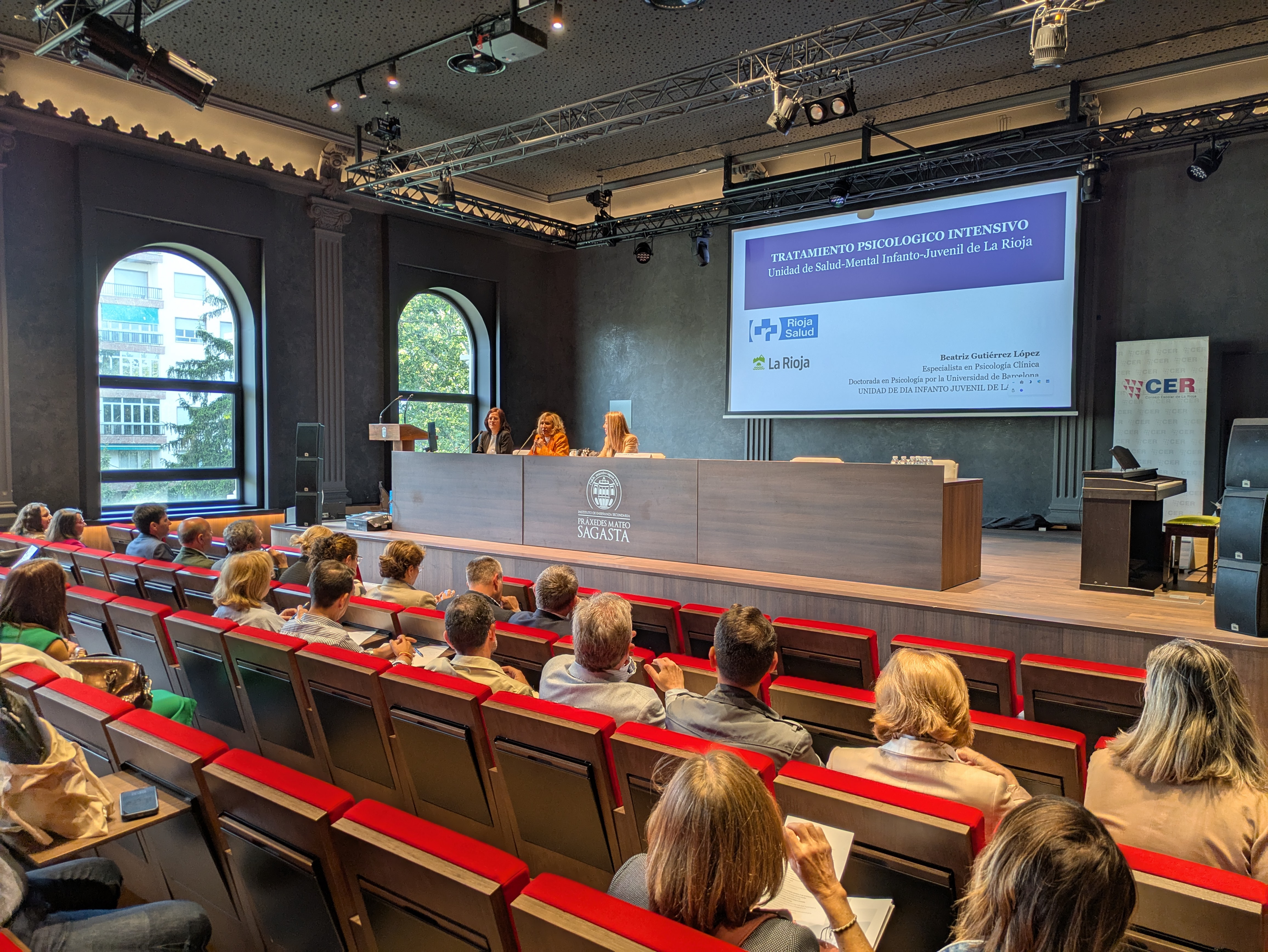 La primera intervención corrió a cargo de Dña. Beatriz Gutiérrez López, especialista en Psicología Clínica de la Unidad Infanto-Juvenil del Hospital San Pedro, con la ponencia: "Programa de Tratamiento Psicológico Intensivo para adolescentes en La Rioja".