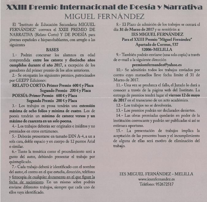 El I.E.S. Miguel Fernández de Melilla convoca el XXIII Premio Internacional de Poesía y Narrativa "Miguel Fernández" de Relato corto y Poesía con el fin de estimular la creación literaria entre los jóvenes. En el mismo, podrán participar alumnos de 14 a 18 años, habiendo premios económicos para los dos mejores trabajos de cada una de las modalidades citadas. El plazo para presentar las obras termina el 31 de marzo de 2017.