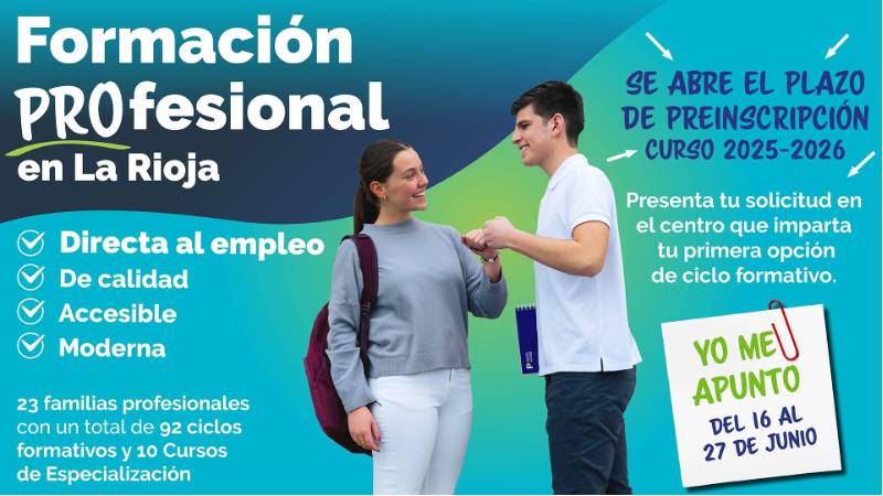Elegir Formación Profesional, es elegir una enseñanza moderna, de calidad y directa al empleo. En la FP de La Rioja puedes estudiar uno de los 92 ciclos formativos que te ofrecen las 23 familias profesionales que se imparten aquí, además de 10 Cursos de Especialización.