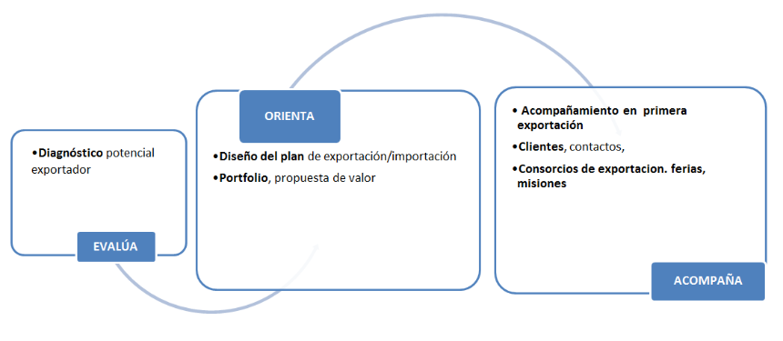 Tiene por objetivo apoyar los primeros pasos en la actividad de internacionalización de cualquier empresa y se configura en las siguientes etapas: