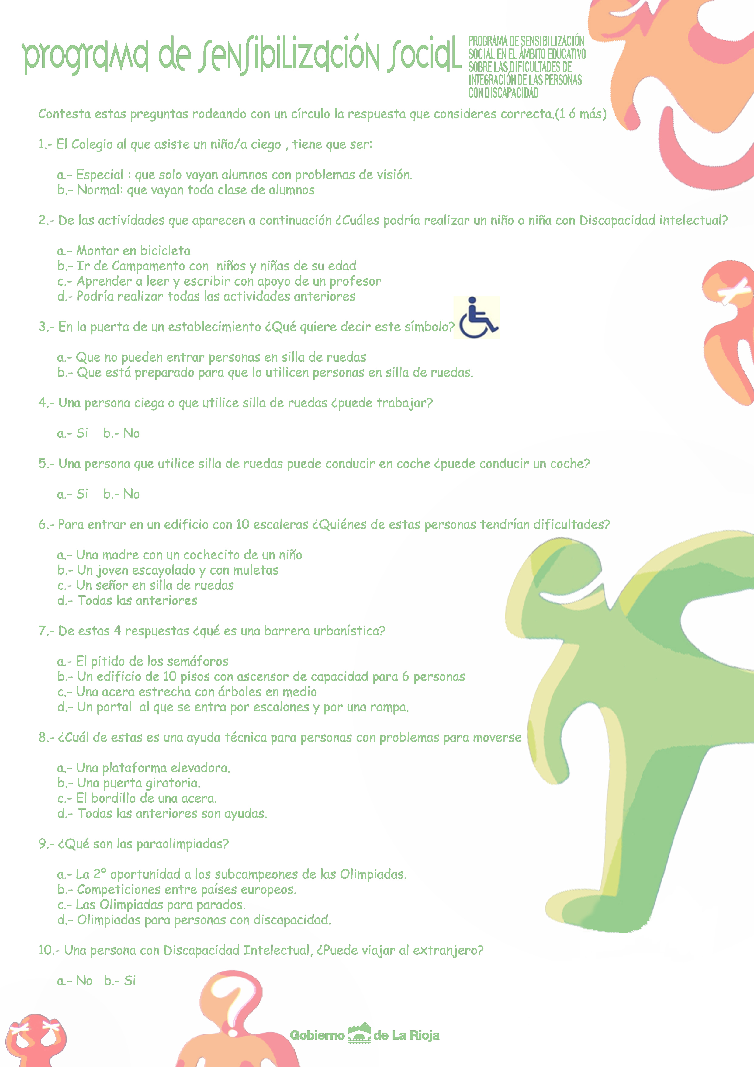 Este Programa pretende mostrar las problemáticas y dificultades con las que tienen que enfrentarse diariamente las personas con discapacidad, porque aunque en la actualidad las personas con discapacidad viven en un ámbito de mayor "normalidad", todavía se enfrentan con barreras en la vida diaria. Se incide en trasmitir información de la realidad que viven en relación con el entorno, no sólo las personas con dificultades en su movilidad, sino también aquellas que por cualquier tipo de discapacidad física, psíquica o sensorial presentan limitaciones para acceso a su entorno, porque las barreras sociales no son solo urbanísticas y arquitectónicas, también las hay en el transporte, en la comunicación y en las relaciones sociales en general. Conscientes de que los niños y niñas de hoy van a ser los responsables de la sociedad del mañana, y de que su educación sentará las bases para un mundo mejor, se ha considerado importante emitir estos mensajes a los pequeños donde son importantes los valores, la concienciación, sensibilización, integración y cooperación de y con todas las personas, y en especial de las personas con algún tipo de discapacidad, que son para las que se trabaja desde los servicios sociales del Gobierno de la Rioja.