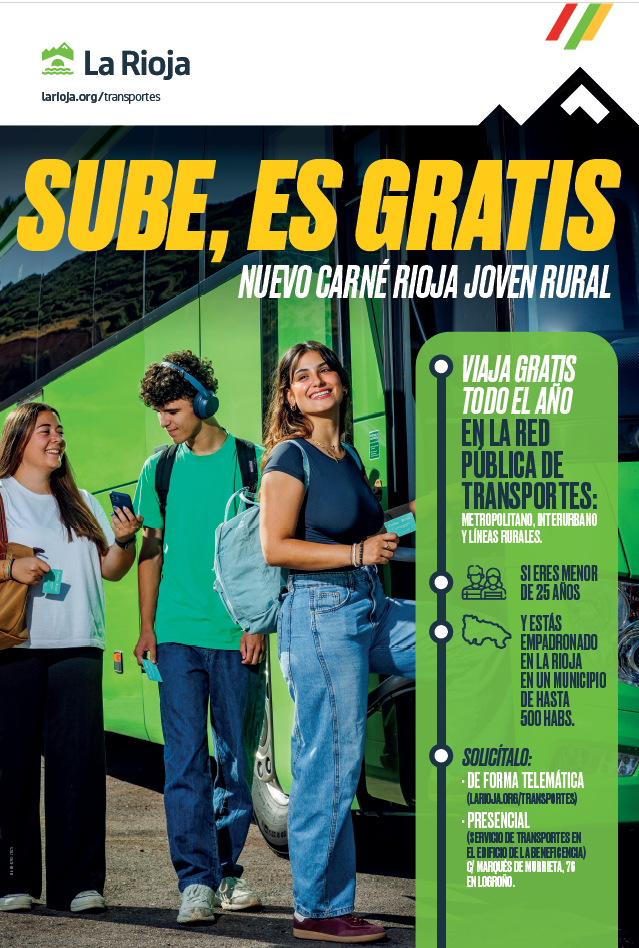 Este carné se dirige a jóvenes menores de 25 años empadronados en alguno de los 134 municipios riojanos con población menor o igual a 500 habitantes, y les permitirá viajar gratuitamente durante todo el año en la red pública de transportes del Gobierno de La Rioja: Metropolitano, Interurbano y Líneas Rurales. Esta medida se enmarca en la política global de bonificaciones al transporte público impulsada por el Ejecutivo regional, que ya contempla ventajas para otros colectivos prioritarios, como menores de edad, personas mayores de 65 años, personas con discapacidad o víctimas de violencia de género o terrorismo.