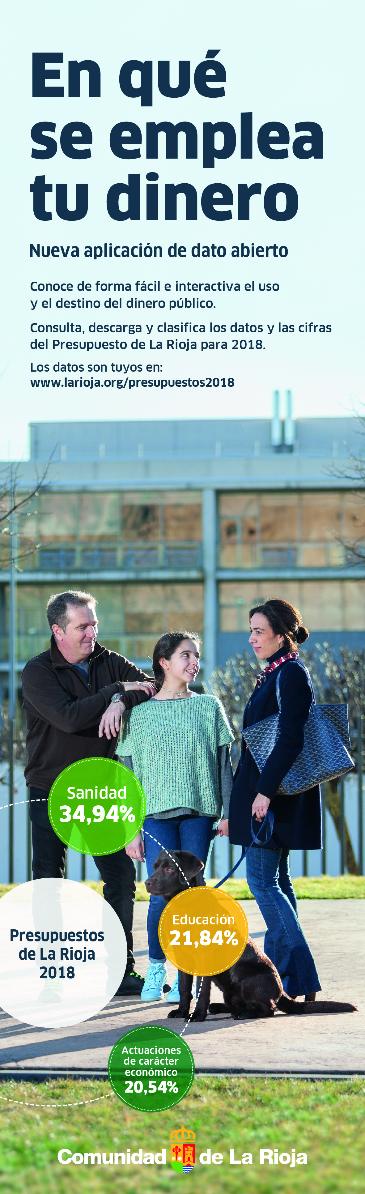 Campaña institucional para dar a conocer a la ciudadanía el uso y el destino de los recursos económicos previstos en la Ley de Presupuestos de la Comunidad Autónoma de La Rioja; así como para dar visibilidad a la transparencia económica de las instituciones y la información ciudadana sobre el uso y destino del dinero público (se pueden consultar a través de la web www.larioja.org/presupuestos2018).